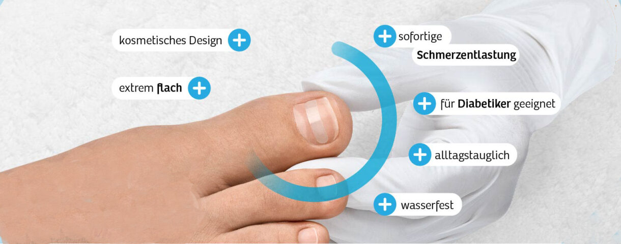 Eine hauchdünne, elastische Spange wird auf den Nagel aufgeklebt. Durch ihre Rückstellkraft hebt sie den seitlichen Nagelrand sanft aus dem Nagelfalz heraus. So wird der Druck reduziert, das Einwachsen verhindert – und der Nagel wächst wieder gesund und schmerzfrei.